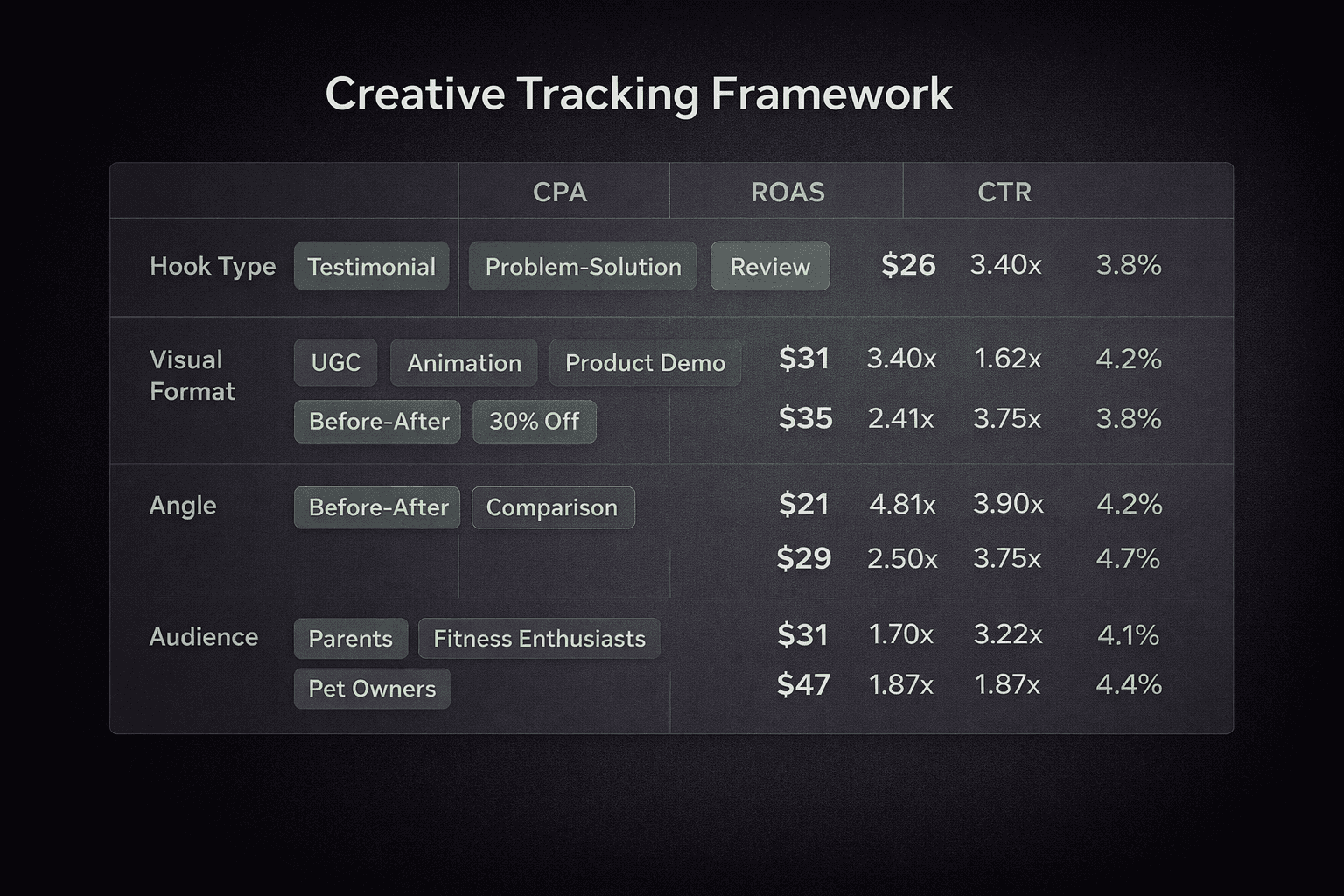 The why lives in the creative elements. Was it the hook? The visual format? The CTA? The angle (social proof vs. product feature vs. problem-solution)? If you cannot answer that question, every new creative brief starts from scratch. You are not learning from your data, you are just running more tests.